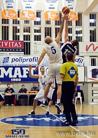 Jobban kezdtek a vendégek, akik többek között Halász Ákos kosaraival 5 pontos előnyben voltak a negyedik percben. A Pécs gyors, lendületes kosárlabdát játszott, és hibázni sem tudtak. Az első negyed közepén viszont megtört a baranyaiak lendülete, Szlávik két gyors egymás utáni kosara után egalizált a SMAFC-NYME. Jött is a vendég időkérés, de ez nem sokat használt. Hazai oldalon a cserejátékosok hamar felvették a játék ritmusát, pár pillanat alatt 15 pontos előnyre tettek szert az egyetemiek.